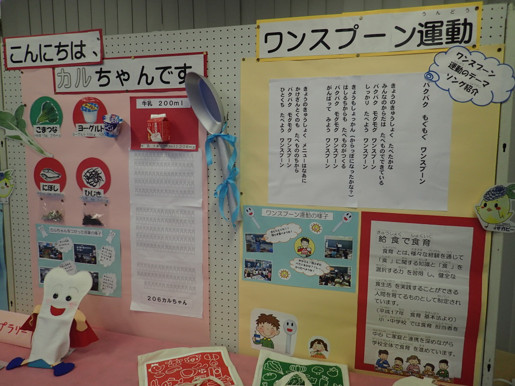 給食における食育コーナーでは、魚の写真をボードに展示してその魚の名前を当てるクイズや、ワンスプーン運動、カルシウムの大切さなどをが説明されていました。