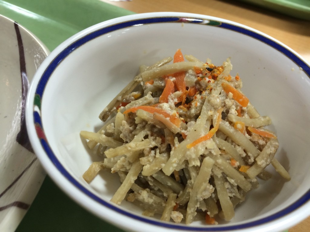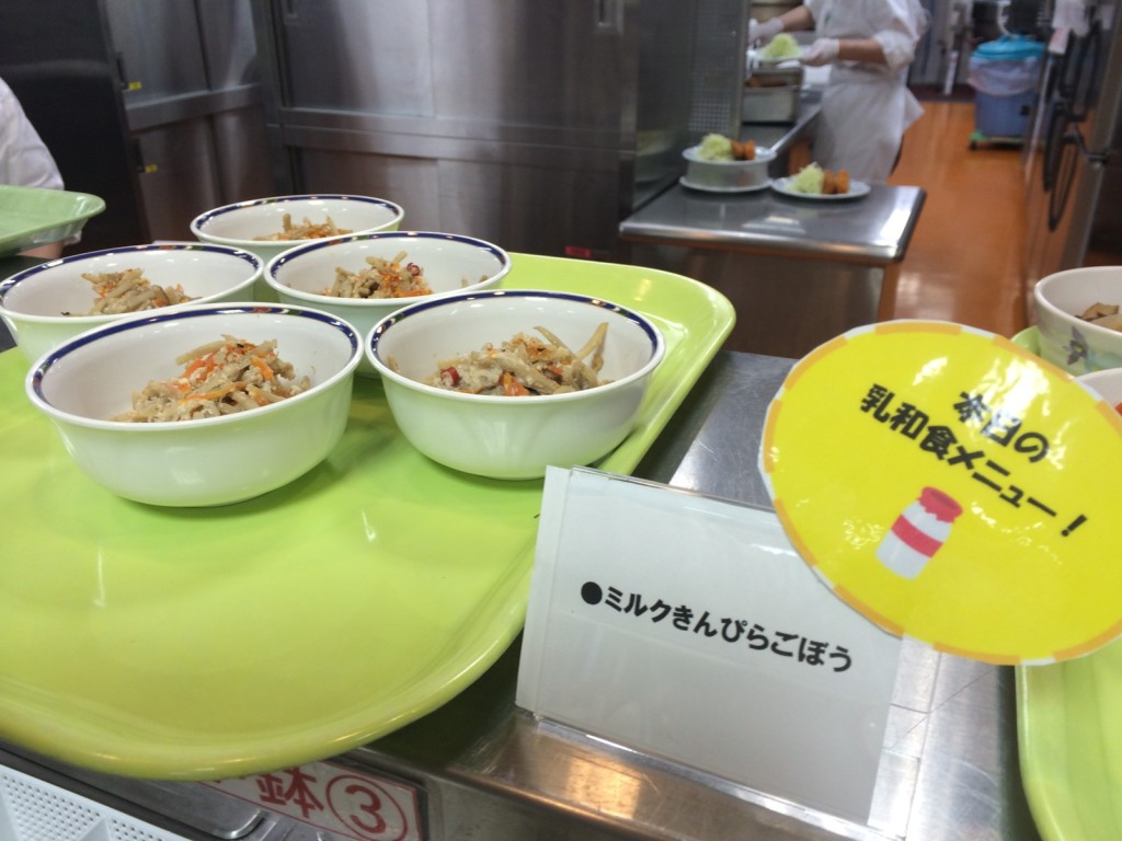 ミルクきんぴらごぼうは、炒めたごぼうに牛乳と砂糖と醤油をあわせておいたものを加え、汁気がなくなるまで炒め煮にします。 牛乳が白和えのような感じになっていますが、とても懐かしい味がしました。