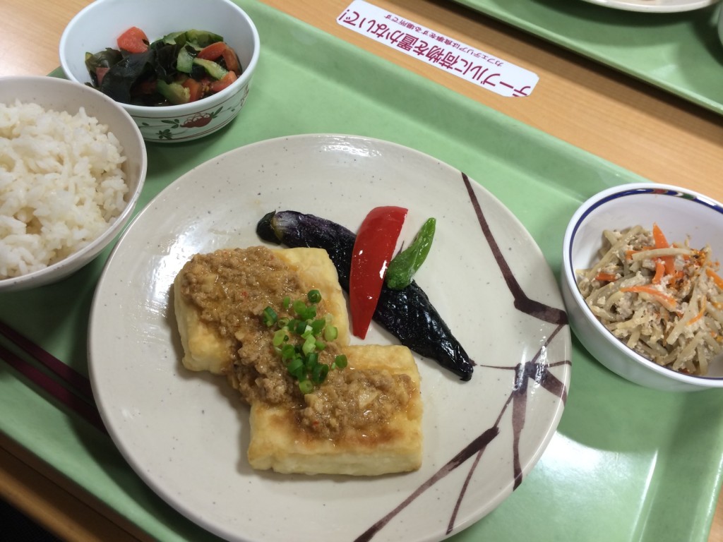 今回、いただいたメニューは、豆腐ステーキ万能ミルク肉味噌ソース、里芋とごぼうの味噌汁、ご飯(胚芽米)、トマトと若布の酢の物、ミルクきんぴらごぼうです。